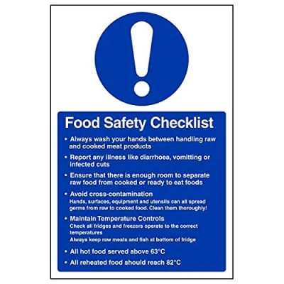 Helps to fulfil legal obligations to remind staff and visitors to wear the appropriate PPE in catering environments to ensure personal safety and maintain hygiene levels Conforms to EN ISO 7010:2012 - Mandatory Signs feature a round symbol with a blue background of at least 50% of the total sign area, with a white pictogram and text Portrait Orientation. Sign reads "Food Safety Checklist. Always Wash Your Hands Between Handling Raw And Cooked Meat Products. Report Any Illness Like Diarrhoea, Vomiting or Infected Cuts" Highly durable Self Adhesive Vinyl material and screen printed message will stand the test of time Sign measures 200 x 300mm. Self Adhesive material will adhere securely to most surfaces