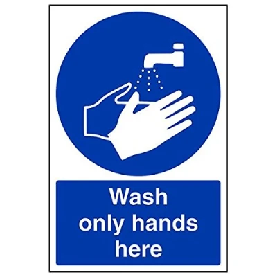 Helps to fulfil legal obligations to remind staff and visitors to wear the appropriate PPE in catering environments to ensure personal safety and maintain hygiene levels Conforms to EN ISO 7010:2012 - Mandatory Signs feature a round symbol with a blue background of at least 50% of the total sign area, with a white pictogram and text Portrait Orientation. Sign reads "Wash Only Hands Here" Highly durable Self Adhesive Vinyl material and screen printed message will stand the test of time Sign measures 200 x 300mm. Self Adhesive material will adhere securely to most surfaces