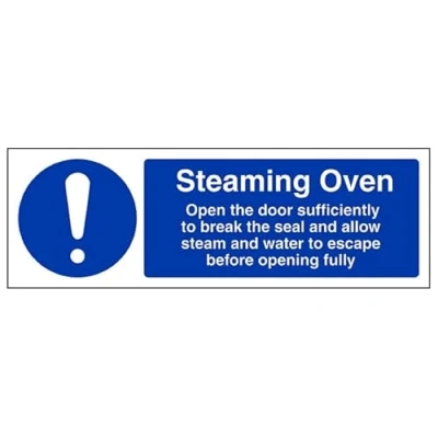 Helps to fulfil legal obligations to remind staff and visitors to wear the appropriate PPE in catering environments to ensure personal safety and maintain hygiene levels Conforms to EN ISO 7010:2012 - Mandatory Signs feature a round symbol with a blue background of at least 50% of the total sign area, with a white pictogram and text Landscape Orientation. Sign reads "Steaming Oven. Open Door Sufficiently To Break The Seal and Allow Steam and Water To Escape Before Opening Fully" Highly durable 1mm plastic material and screen printed message will stand the test of time Sign measures 300 x 100mm.
