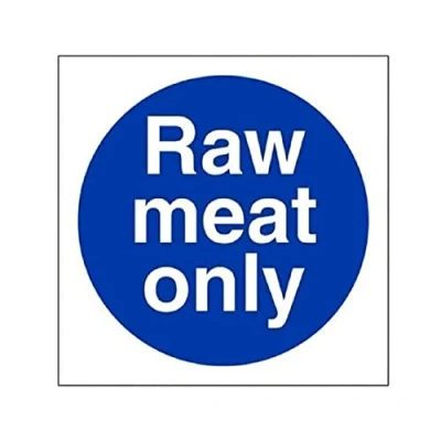 Helps to fulfil legal obligations to remind staff and visitors to wear the appropriate PPE in catering environments to ensure personal safety and maintain hygiene levels Conforms to EN ISO 7010:2012 - Mandatory Signs feature a round symbol with a blue background of at least 50% of the total sign area, with a white pictogram and text Square Orientation. Sign reads "Raw Meat Only" Highly durable Self Adhesive Vinyl material and screen printed message will stand the test of time Sign measures 100 x 100mm. Self Adhesive material will adhere securely to most surfaces