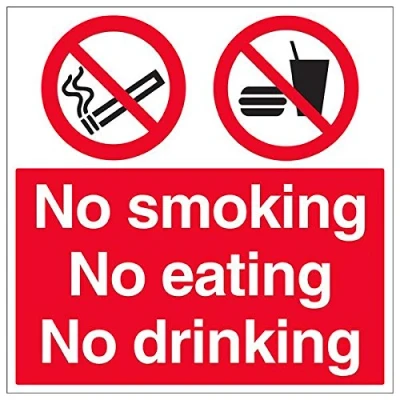 Helps to fulfil legal obligations to remind staff and visitors to wear the appropriate PPE in catering environments to ensure personal safety and maintain hygiene levels Conforms to EN ISO 7010:2012 - Mandatory Signs feature a round symbol with a blue background of at least 50% of the total sign area, with a white pictogram and text Square Orientation. Sign reads "No Smoking, No Eating, No Drinking" Highly durable 1mm plastic material and screen printed message will stand the test of time Sign measures 450 x 450mm.