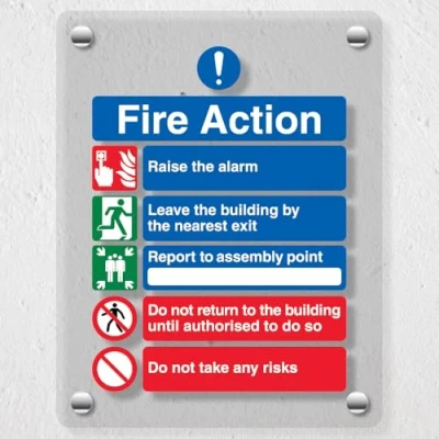 Vibrant, high-quality print enhanced with a white backing to ensure clear, eye-catching messaging Increased visibility and added sense of depth is achieved through the use of the 20mm wall mounted stand-off fixings Complies with EN ISO 7010 and BS 5499 Fire safety signs, notices and graphic symbols Designed to display clear messages in a fire emergency Professional high-gloss finish - the transparent Perspex material enhances readability to effectively convey safety messages and information