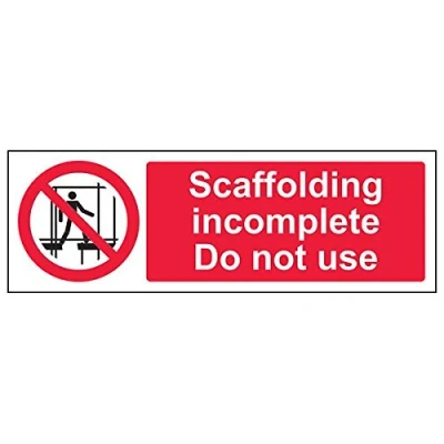 Clearly displays prohibited and potentially dangerous actions which employees and visitors must avoid in the interests of health and safety as per Health and Safety (Safety Signs & Signals) Regulations 1996 Conforms to EN ISO 7010:2012 - Prohibition signs feature a red circular symbol of at least 35% of the total sign area, on a white background, with a black pictogram Landscape Orientation. Sign reads "Scaffolding Incomplete. Do Not Use" Highly durable 1mm plastic material and screen printed message will stand the test of time Sign measures 300 x 100mm.