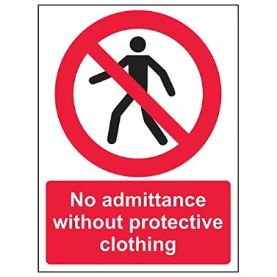 Clearly displays prohibited and potentially dangerous actions which employees and visitors must avoid in the interests of health and safety as per Health and Safety (Safety Signs & Signals) Regulations 1996 Conforms to EN ISO 7010:2012 - Prohibition signs feature a red circular symbol of at least 35% of the total sign area, on a white background, with a black pictogram Portrait Orientation. Sign reads "No Admittance Without Protective Clothing" Highly durable Self Adhesive Vinyl material and screen printed message will stand the test of time Sign measures 150 x 200mm. Self Adhesive material will adhere securely to most surfaces