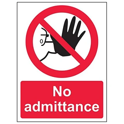 Clearly displays prohibited and potentially dangerous actions which employees and visitors must avoid in the interests of health and safety as per Health and Safety (Safety Signs & Signals) Regulations 1996 Conforms to EN ISO 7010:2012 - Prohibition signs feature a red circular symbol of at least 35% of the total sign area, on a white background, with a black pictogram Portrait Orientation. Sign reads "No Admittance" Highly durable Self Adhesive Vinyl material and screen printed message will stand the test of time Sign measures 150 x 200mm. Self Adhesive material will adhere securely to most surfaces