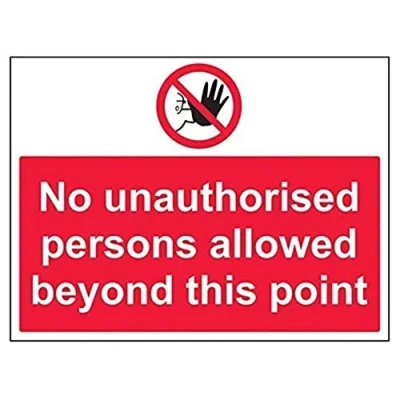 Clearly displays prohibited and potentially dangerous actions which employees and visitors must avoid in the interests of health and safety as per Health and Safety (Safety Signs & Signals) Regulations 1996 Conforms to EN ISO 7010:2012 - Prohibition signs feature a red circular symbol of at least 35% of the total sign area, on a white background, with a black pictogram Landscape Orientation. Sign reads "No Unauthorised Persons Allowed Beyond This Point" Highly durable 1mm plastic material and screen printed message will stand the test of time Sign measures 400 x 300mm