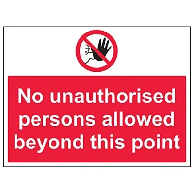 Clearly displays prohibited and potentially dangerous actions which employees and visitors must avoid in the interests of health and safety as per Health and Safety (Safety Signs & Signals) Regulations 1996 Conforms to EN ISO 7010:2012 - Prohibition signs feature a red circular symbol of at least 35% of the total sign area, on a white background, with a black pictogram Landscape Orientation. Sign reads "No Unauthorised Persons Allowed Beyond This Point" Highly durable 1mm plastic material and screen printed message will stand the test of time Sign measures 400 x 300mm.