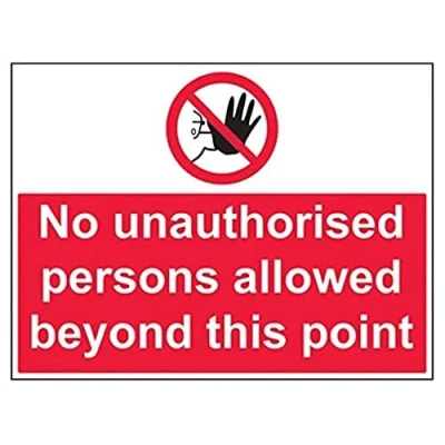 Clearly displays prohibited and potentially dangerous actions which employees and visitors must avoid in the interests of health and safety as per Health and Safety (Safety Signs & Signals) Regulations 1996 Conforms to EN ISO 7010:2012 - Prohibition signs feature a red circular symbol of at least 35% of the total sign area, on a white background, with a black pictogram Landscape Orientation. Sign reads "No Unauthorised Persons Allowed Beyond This Point" Screen printed on high quality 2mm rigid plastic material Sign measures 600 x 450mm
