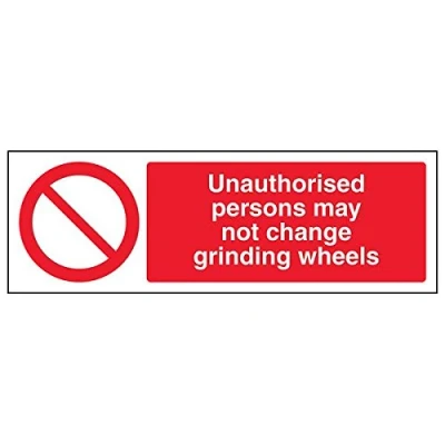 Clearly displays prohibited and potentially dangerous actions which employees and visitors must avoid in the interests of health and safety as per Health and Safety (Safety Signs & Signals) Regulations 1996 Conforms to EN ISO 7010:2012 - Prohibition signs feature a red circular symbol of at least 35% of the total sign area, on a white background, with a black pictogram Landscape Orientation. Sign reads "Unauthorised Persons May Not Change Grinding Wheels" Highly durable 1mm plastic material and screen printed message will stand the test of time Sign measures 300 x 100mm.