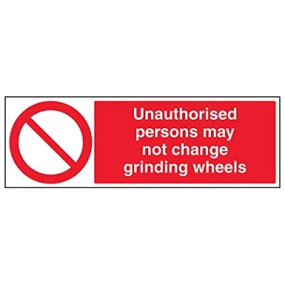 Clearly displays prohibited and potentially dangerous actions which employees and visitors must avoid in the interests of health and safety as per Health and Safety (Safety Signs & Signals) Regulations 1996 Conforms to EN ISO 7010:2012 - Prohibition signs feature a red circular symbol of at least 35% of the total sign area, on a white background, with a black pictogram Landscape Orientation. Sign reads "Unauthorised Persons May Not Change Grinding Wheels" Highly durable 1mm plastic material and screen printed message will stand the test of time Sign measures 600 x 200mm.