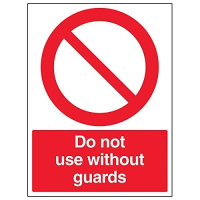 Clearly displays prohibited and potentially dangerous actions which employees and visitors must avoid in the interests of health and safety as per Health and Safety (Safety Signs & Signals) Regulations 1996 Conforms to EN ISO 7010:2012 - Prohibition signs feature a red circular symbol of at least 35% of the total sign area, on a white background, with a black pictogram Portrait Orientation. Sign reads "Do Not Use Without Guards" Highly durable 1mm plastic material and screen printed message will stand the test of time Sign measures 300 x 400mm.