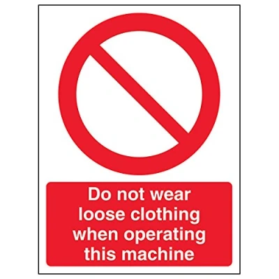 Clearly displays prohibited and potentially dangerous actions which employees and visitors must avoid in the interests of health and safety as per Health and Safety (Safety Signs & Signals) Regulations 1996 Conforms to EN ISO 7010:2012 - Prohibition signs feature a red circular symbol of at least 35% of the total sign area, on a white background, with a black pictogram Portrait Orientation. Sign reads "Do Not Wear Loose Clothing When Operating This Machine" Highly durable Self Adhesive Vinyl material and screen printed message will stand the test of time Sign measures 150 x 200mm. Self Adhesive material will adhere securely to most surfaces