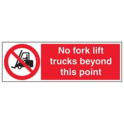 Clearly displays prohibited and potentially dangerous actions which employees and visitors must avoid in the interests of health and safety as per Health and Safety (Safety Signs & Signals) Regulations 1996 Conforms to EN ISO 7010:2012 - Prohibition signs feature a red circular symbol of at least 35% of the total sign area, on a white background, with a black pictogram Landscape Orientation. Sign reads "No Fork Lift Trucks Beyond This Point" Highly durable Self Adhesive Vinyl material and screen printed message will stand the test of time Sign measures 600 x 200mm. Self Adhesive material will adhere securely to most surfaces