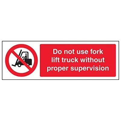 Clearly displays prohibited and potentially dangerous actions which employees and visitors must avoid in the interests of health and safety as per Health and Safety (Safety Signs & Signals) Regulations 1996 Conforms to EN ISO 7010:2012 - Prohibition signs feature a red circular symbol of at least 35% of the total sign area, on a white background, with a black pictogram Landscape Orientation. Sign reads "Do Not Use Fork Lift Truck Without Proper Supervision" Highly durable 1mm plastic material and screen printed message will stand the test of time Sign measures 300 x 100mm.