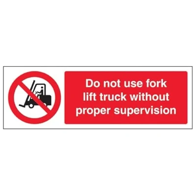 Clearly displays prohibited and potentially dangerous actions which employees and visitors must avoid in the interests of health and safety as per Health and Safety (Safety Signs & Signals) Regulations 1996 Conforms to EN ISO 7010:2012 - Prohibition signs feature a red circular symbol of at least 35% of the total sign area, on a white background, with a black pictogram Landscape Orientation. Sign reads "Do Not Use Fork Lift Truck Without Proper Supervision" Highly durable 1mm plastic material and screen printed message will stand the test of time Sign measures 600 x 200mm.