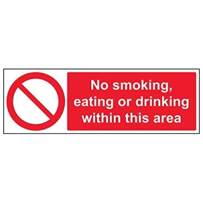 Clearly establishes areas where smoking is prohibited to employees and visitors. Complies with the Smoke-free (Signs) Regulations 2007 Conforms to EN ISO 7010:2012 - Prohibition signs feature a red circular symbol of at least 35% of the total sign area, on a white background, with a black pictogram Landscape Orientation. Sign reads "No Smoking, Eating or Drinking Within This Area" Highly durable 1mm plastic material and screen printed message will stand the test of time Sign measures 450 x 150mm.