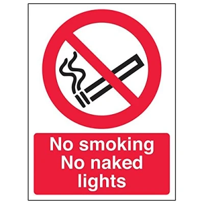 Clearly establishes areas where smoking is prohibited to employees and visitors. Complies with the Smoke-free (Signs) Regulations 2007 Conforms to EN ISO 7010:2012 - Prohibition signs feature a red circular symbol of at least 35% of the total sign area, on a white background, with a black pictogram Portrait Orientation. Sign reads "No Smoking No Naked Lights" Highly durable Self Adhesive Vinyl material and screen printed message will stand the test of time Sign measures 150 x 200mm. Self Adhesive material will adhere securely to most surfaces