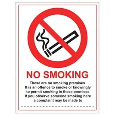 Clearly establishes areas where smoking is prohibited to employees and visitors. Complies with the Smoke-free (Signs) Regulations 2007 Conforms to EN ISO 7010:2012 - Prohibition signs feature a red circular symbol of at least 35% of the total sign area, on a white background, with a black pictogram Portrait Orientation. Sign reads "No Smoking. These Are No Smoking Premises. If You Observe Someone Smoking Here, A Complaint May Be Made To" Highly durable 1mm plastic material and screen printed message will stand the test of time Sign measures 300 x 400mm.