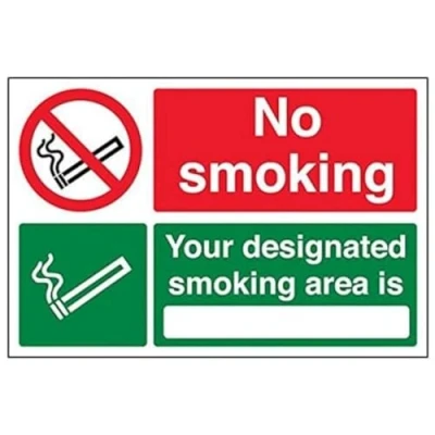 Clearly establishes areas where smoking is prohibited to employees and visitors. Complies with the Smoke-free (Signs) Regulations 2007 Conforms to EN ISO 7010:2012 - Prohibition signs feature a red circular symbol of at least 35% of the total sign area, on a white background, with a black pictogram Landscape Orientation. Sign reads "No Smoking. Your Designated Smoking Area Is" Highly durable Self Adhesive Vinyl material and screen printed message will stand the test of time Sign measures 300 x 200mm. Self Adhesive material will adhere securely to most surfaces