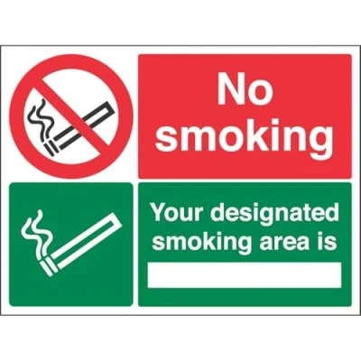 Clearly establishes areas where smoking is prohibited to employees and visitors. Complies with the Smoke-free (Signs) Regulations 2007 Conforms to EN ISO 7010:2012 - Prohibition signs feature a red circular symbol of at least 35% of the total sign area, on a white background, with a black pictogram Landscape Orientation. Sign reads "No Smoking. Your Designated Smoking Area Is" Highly durable 1mm plastic material and screen printed message will stand the test of time Sign measures 400 x 300mm.