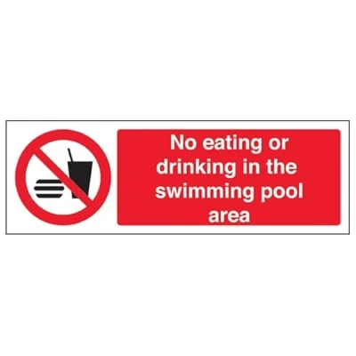 Clearly displays prohibited and potentially dangerous actions which employees and visitors must avoid in the interests of health and safety as per Health and Safety (Safety Signs & Signals) Regulations 1996 Conforms to EN ISO 7010:2012 - Prohibition signs feature a red circular symbol of at least 35% of the total sign area, on a white background, with a black pictogram Landscape Orientation. Sign reads "No Eating Or Drinking In The Swimming Pool Area" Highly durable 1mm plastic material and screen printed message will stand the test of time Sign measures 450 x 150mm.