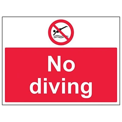 Clearly displays prohibited and potentially dangerous actions which employees and visitors must avoid in the interests of health and safety as per Health and Safety (Safety Signs & Signals) Regulations 1996 Conforms to EN ISO 7010:2012 - Prohibition signs feature a red circular symbol of at least 35% of the total sign area, on a white background, with a black pictogram Landscape Orientation. Sign reads "No Diving" Highly durable Self Adhesive Vinyl material and screen printed message will stand the test of time Sign measures 400 x 300mm. Self Adhesive material will adhere securely to most surfaces