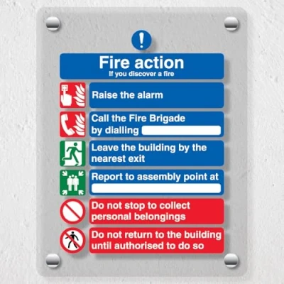 Vibrant, high-quality print enhanced with a white backing to ensure clear, eye-catching messaging Increased visibility and added sense of depth is achieved through the use of the 20mm wall mounted stand-off fixings Complies with EN ISO 7010 and BS 5499 Fire safety signs, notices and graphic symbols Designed to display clear messages in a fire emergency Professional high-gloss finish - the transparent Perspex material enhances readability to effectively convey safety messages and information