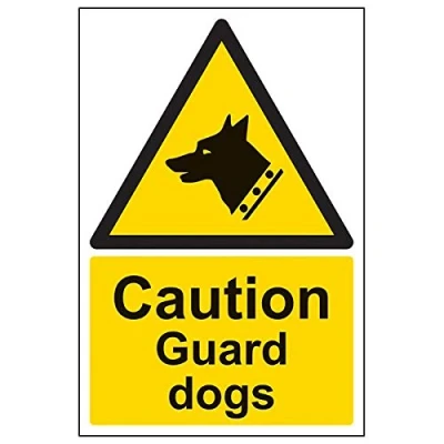 Helps to fulfil legal obligations to inform employees, visitors and the general public of potential hazards as per Health and Safety (Safety Signs & Signals) Regulations 1996 Conforms to EN ISO 7010:2012 - Warning signs feature a triangular symbol with a black pictogram and yellow background occupying at least 50% of the total sign area Portrait Orientation. Sign reads "Caution. Guard Dogs" Highly durable Self Adhesive Vinyl material and screen printed message will stand the test of time Sign measures 200 x 300mm. Self Adhesive material will adhere securely to most surfaces