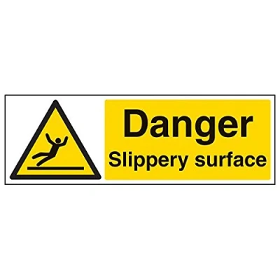 Helps to fulfil legal obligations to inform employees, visitors and the general public of potential hazards as per Health and Safety (Safety Signs & Signals) Regulations 1996 Conforms to EN ISO 7010:2012 - Warning signs feature a triangular symbol with a black pictogram and yellow background occupying at least 50% of the total sign area Landscape Orientation. Sign reads "Danger. Slippery Surface" Highly durable Self Adhesive Vinyl material and screen printed message will stand the test of time Sign measures 450 x 150mm. Self Adhesive material will adhere securely to most surfaces