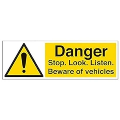 Helps to fulfil legal obligations to inform employees, visitors and the general public of potential hazards as per Health and Safety (Safety Signs & Signals) Regulations 1996 Conforms to EN ISO 7010:2012 - Warning signs feature a triangular symbol with a black pictogram and yellow background occupying at least 50% of the total sign area Landscape Orientation. Sign reads "Danger. Stop. Look. Listen. Beware Of Vehicles" Highly durable 1mm plastic material and screen printed message will stand the test of time Sign measures 450 x 150mm.