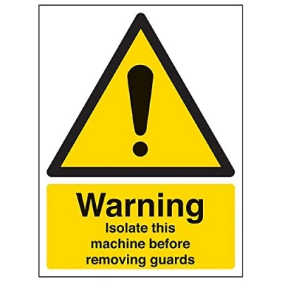 Helps to fulfil legal obligations to inform employees, visitors and the general public of potential hazards as per Health and Safety (Safety Signs & Signals) Regulations 1996 Conforms to EN ISO 7010:2012 - Warning signs feature a triangular symbol with a black pictogram and yellow background occupying at least 50% of the total sign area Portrait Orientation. Sign reads "Warning. Isolate This Machine Before Removing Guards" Highly durable 1mm plastic material and screen printed message will stand the test of time Sign measures 150 x 200mm.