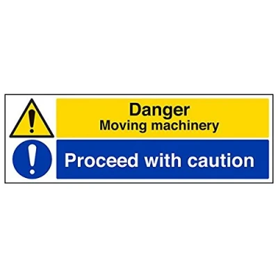 Helps to fulfil legal obligations to inform employees, visitors and the general public of potential hazards as per Health and Safety (Safety Signs & Signals) Regulations 1996 Conforms to EN ISO 7010:2012 - Warning signs feature a triangular symbol with a black pictogram and yellow background occupying at least 50% of the total sign area Landscape Orientation. Sign reads "Danger. Moving Machinery. Proceed With Caution" Highly durable Self Adhesive Vinyl material and screen printed message will stand the test of time Sign measures 600 x 200mm. Self Adhesive material will adhere securely to most surfaces