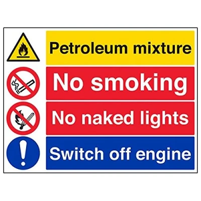 Helps to fulfil legal obligations to inform employees, visitors and the general public of potential hazards as per Health and Safety (Safety Signs & Signals) Regulations 1996 Conforms to EN ISO 7010:2012 - Warning signs feature a triangular symbol with a black pictogram and yellow background occupying at least 50% of the total sign area Landscape Orientation. Sign reads "Petroleum Mixture. No Smoking. No Naked Lights. Switch Off Engine" Highly durable 1mm plastic material and screen printed message will stand the test of time Sign measures 600 x 450mm.