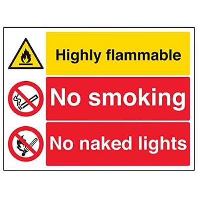 Helps to fulfil legal obligations to inform employees, visitors and the general public of potential hazards as per Health and Safety (Safety Signs & Signals) Regulations 1996 Conforms to EN ISO 7010:2012 - Warning signs feature a triangular symbol with a black pictogram and yellow background occupying at least 50% of the total sign area Landscape Orientation. Sign reads "Highly Flammable. No Smoking. No Naked Lights" Highly durable Self Adhesive Vinyl material and screen printed message will stand the test of time Sign measures 400 x 300mm. Self Adhesive material will adhere securely to most surfaces