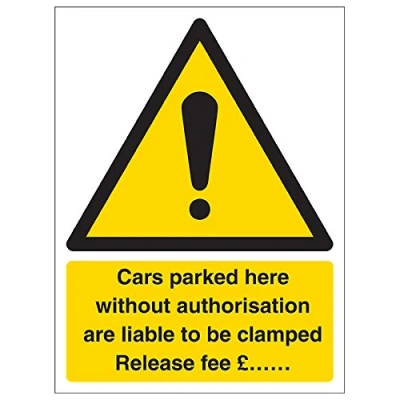 Helps to fulfil legal obligations to inform employees, visitors and the general public of potential hazards as per Health and Safety (Safety Signs & Signals) Regulations 1996 Conforms to EN ISO 7010:2012 - Warning signs feature a triangular symbol with a black pictogram and yellow background occupying at least 50% of the total sign area Portrait Orientation. Sign reads "Cars Parked Here Without Authorisation Are Liable To Be Clamped. Release Fee £…." Highly durable 1mm plastic material and screen printed message will stand the test of time Sign measures 150 x 200mm.