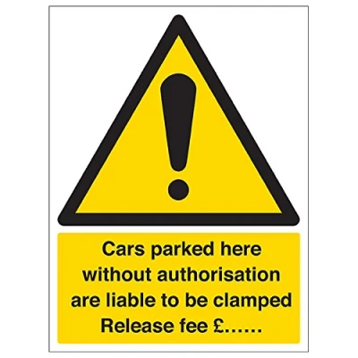 Helps to fulfil legal obligations to inform employees, visitors and the general public of potential hazards as per Health and Safety (Safety Signs & Signals) Regulations 1996 Conforms to EN ISO 7010:2012 - Warning signs feature a triangular symbol with a black pictogram and yellow background occupying at least 50% of the total sign area Portrait Orientation. Sign reads "Cars Parked Here Without Authorisation Are Liable To Be Clamped. Release Fee £…." Highly durable 1mm plastic material and screen printed message will stand the test of time Sign measures 300 x 400mm.