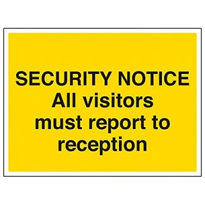 Helps to fulfil legal obligations to inform employees, visitors and the general public of potential hazards as per Health and Safety (Safety Signs & Signals) Regulations 1996 Conforms to EN ISO 7010:2012 - Warning signs feature a triangular symbol with a black pictogram and yellow background occupying at least 50% of the total sign area Landscape Orientation. Sign reads "Security Notice. All Visitors Must Report To Reception" Highly durable 1mm plastic material and screen printed message will stand the test of time Sign measures 400 x 300mm.