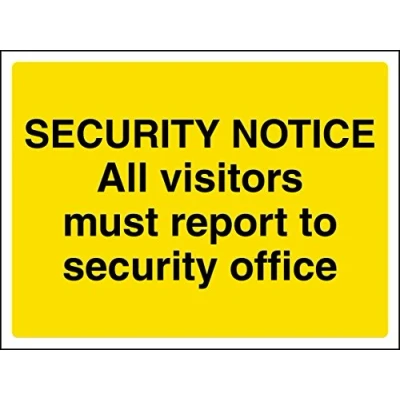 Helps to fulfil legal obligations to inform employees, visitors and the general public of potential hazards as per Health and Safety (Safety Signs & Signals) Regulations 1996 Conforms to EN ISO 7010:2012 - Warning signs feature a triangular symbol with a black pictogram and yellow background occupying at least 50% of the total sign area Landscape Orientation. Sign reads "Security Notice. All Visitors Must Report To Security Office" Highly durable Self Adhesive Vinyl material and screen printed message will stand the test of time Sign measures 200 x 150mm. Self Adhesive material will adhere securely to most surfaces