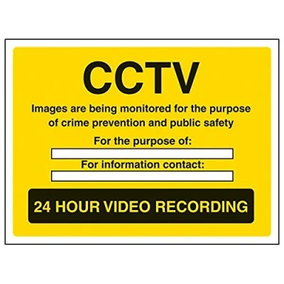 Helps to fulfil legal obligations to inform employees, visitors and the general public of potential hazards as per Health and Safety (Safety Signs & Signals) Regulations 1996 Conforms to EN ISO 7010:2012 - Warning signs feature a triangular symbol with a black pictogram and yellow background occupying at least 50% of the total sign area Landscape Orientation. Sign reads "CCTV Images Are Being Monitored For The Purpose Of Crime Prevention And Public Safety. For The Purpose Of. For Information Contact. 24 Hour Video Recording" Highly durable Self Adhesive Vinyl material and screen printed message will stand the test of time Sign measures 200 x 150mm. Self Adhesive material will adhere securely to most surfaces