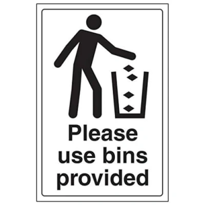 Clearly displays easily understood message, can be used in a number of locations, as per Health and Safety (Safety Signs & Signals) Regulations 1996 Conforms to EN ISO 7010:2012 Portrait Orientation. Sign reads "Please Use Bins Provided" Highly durable Self Adhesive Vinyl material and screen printed message will stand the test of time Sign measures 200 x 300mm. Self Adhesive material will adhere securely to most surfaces