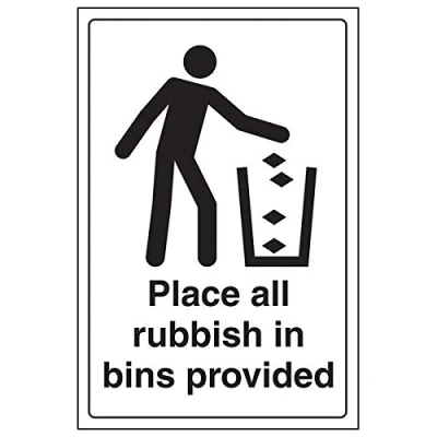 Clearly displays easily understood message, can be used in a number of locations, as per Health and Safety (Safety Signs & Signals) Regulations 1996 Conforms to EN ISO 7010:2012 Portrait Orientation. Sign reads "Place All Rubbish In Bins Provided" Highly durable Self Adhesive Vinyl material and screen printed message will stand the test of time Sign measures 200 x 300mm. Self Adhesive material will adhere securely to most surfaces