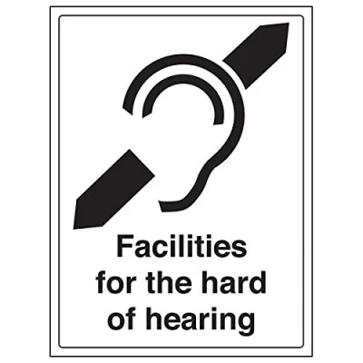 Clearly displays easily understood message, can be used in a number of locations, as per Health and Safety (Safety Signs & Signals) Regulations 1996 Conforms to EN ISO 7010:2012 Portrait Orientation. Sign reads "Facilities For The Hard Of Hearing" Highly durable Self Adhesive Vinyl material and screen printed message will stand the test of time Sign measures 300 x 400mm. Self Adhesive material will adhere securely to most surfaces