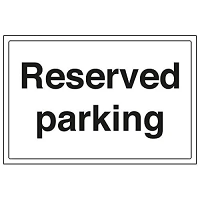 Helps to fulfil legal obligations to advise the public of actions or restrictions concerning parking, as per Health and Safety (Safety Signs & Signals) Regulations 1996 Conforms to EN ISO 7010:2012 Landscape Orientation. Sign reads "Reserved Parking" Highly durable Self Adhesive Vinyl material and screen printed message will stand the test of time Sign measures 300 x 200mm. Self Adhesive material will adhere securely to most surfaces