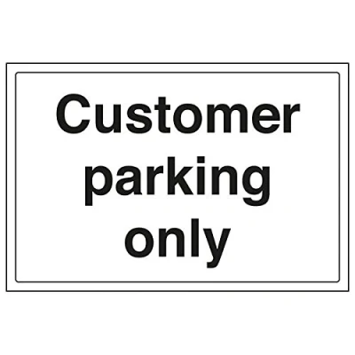 Helps to fulfil legal obligations to advise the public of actions or restrictions concerning parking, as per Health and Safety (Safety Signs & Signals) Regulations 1996 Conforms to EN ISO 7010:2012 Landscape Orientation. Sign reads "Customer Parking Only" Highly durable Self Adhesive Vinyl material and screen printed message will stand the test of time Sign measures 300 x 200mm. Self Adhesive material will adhere securely to most surfaces