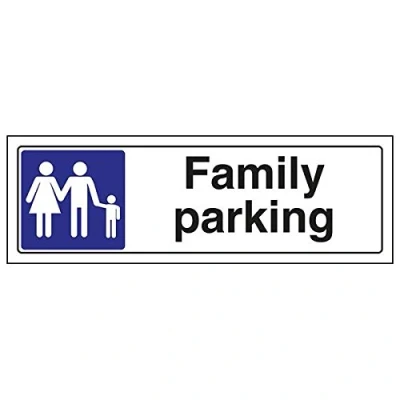 Helps to fulfil legal obligations to advise the public of actions or restrictions concerning parking, as per Health and Safety (Safety Signs & Signals) Regulations 1996 Conforms to EN ISO 7010:2012 Landscape Orientation. Sign reads "Family Parking" Highly durable Self Adhesive Vinyl material and screen printed message will stand the test of time Sign measures 300 x 100mm. Self Adhesive material will adhere securely to most surfaces