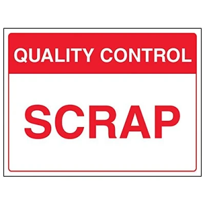 Communicates relevant quality control measures on your site to employees Conforms to EN ISO 7010:2012 Landscape Orientation. Sign reads "Quality Control. Scrap" Highly durable Self Adhesive Vinyl material and screen printed message will stand the test of time Sign measures 400 x 300mm. Self Adhesive material will adhere securely to most surfaces