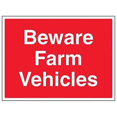 Provides essential information of the dangers on private properties to ensure personal safety as per Health and Safety (Safety Signs & Signals) Regulations 1996 Conforms to EN ISO 7010:2012 Landscape Orientation. Sign reads "Beware. Farm Vehicles" Highly durable Self Adhesive Vinyl material and screen printed message will stand the test of time Sign measures 400 x 300mm. Self Adhesive material will adhere securely to most surfaces