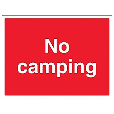 Provides essential information of the dangers on private properties to ensure personal safety as per Health and Safety (Safety Signs & Signals) Regulations 1996 Conforms to EN ISO 7010:2012 Landscape Orientation. Sign reads "No Camping" Highly durable Self Adhesive Vinyl material and screen printed message will stand the test of time Sign measures 400 x 300mm. Self Adhesive material will adhere securely to most surfaces