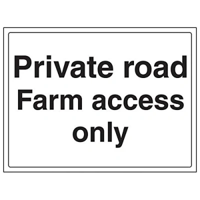 Provides essential information of the dangers on private properties to ensure personal safety as per Health and Safety (Safety Signs & Signals) Regulations 1996 Conforms to EN ISO 7010:2012 Landscape Orientation. Sign reads "Private Road Farm Access Only" Highly durable Self Adhesive Vinyl material and screen printed message will stand the test of time Sign measures 400 x 300mm. Self Adhesive material will adhere securely to most surfaces