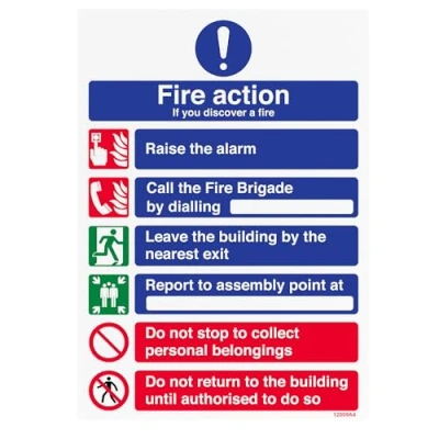 Clear fire action guidance – Lists six essential steps to follow if a fire is discovered, helping improve on-site emergency awareness. Highly visible A4 format – Easy to read from a distance; suitable for mounting in corridors, stairwells, lobbies, or next to fire alarms. Rigid 1mm plastic construction – Durable, weather-resistant material ideal for indoor wall mounting in busy environments. Bold colours and icons – Uses red, blue, and white with ISO-standard symbols to attract attention and aid understanding in emergencies. Supports fire safety compliance – Helps meet legal obligations under the Regulatory Reform (Fire Safety) Order and UK workplace guidance.